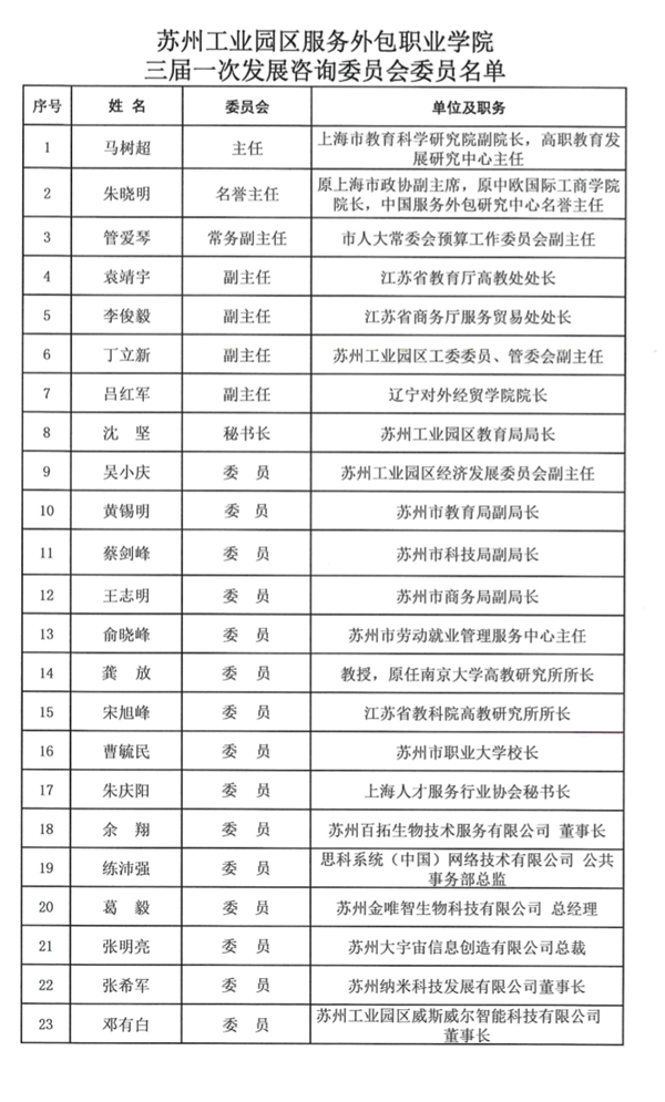 发展咨询委员会是学院的"专家库"和"智囊团",它为学院科学制定发展规划、创新人才培养模式、推进科技项目开发、促进官产学研一体化合作等重大事务提供咨询、指导、评议和论证服务,使学院的办学定位和办学行为更加具有前瞻性、创新性、科学性和实用性,人才培养更加符合行业企业对高素质技能型服务外包人才的需求,切实保证实现学院确立的毕业生"零公里"就业的人才培养目标。受聘的20多位专家分别来自政府、高校及企业,这些来自不同层面的专家有助于为学院提供来自不同领域内的意见,为学院发展提供智力支撑。